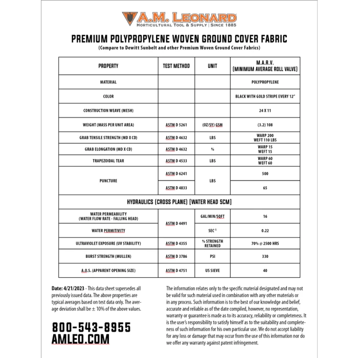 This woven ground cover conserves water by design, and is approved for most government weed control applications. Gold stripes are spaced every 1ft along length of the roll to allow for easy plant layout and container yard organization. UV stabilized polypropylene provides industry standard UV stability – 70% of original strength is retained after 2,500 hours of xenon arc testing exposure.