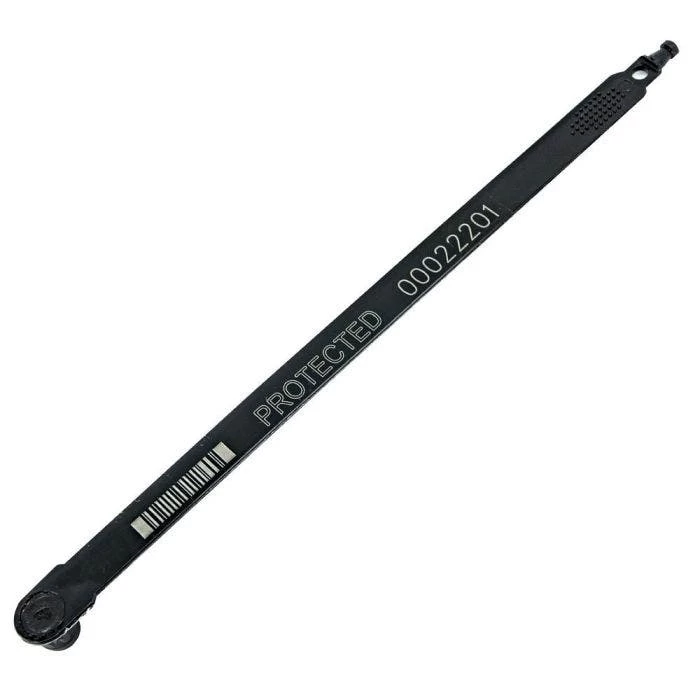 These security seals feature a durable plastic construction. These black seals measure 7-1/2 inches in length. You personalize these seals with your company name or logo and number sequence. This box contains 1,000 seals. Plastic Security Seals have several uses. Use them to secure loads or trailers to deter theft. They are also ideal for labeling trees and shrubs for landscaping jobs. These plastic security seals are the perfect solution for sealing equipment. Their durable plastic construction resists degradation caused by weather. Best of all, they are 100% made in the USA! To start your customized order, please call us at (800) 543-8955. Also available in a non-customized version.