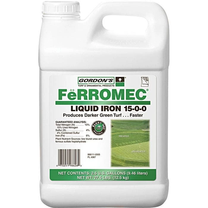 This Ferromec AC Liquid Iron with nitrogen will quickly greenup turf and ornamentals in 12 to 48 hours. A great spray to speed up recovery from dormancy, and a fast way to correct iron chlorosis in herbaceous plants, shrubs and trees. This foliar spray has a combination of nitrogen (15), sulfur (3), and iron (6) for healthy growth.
