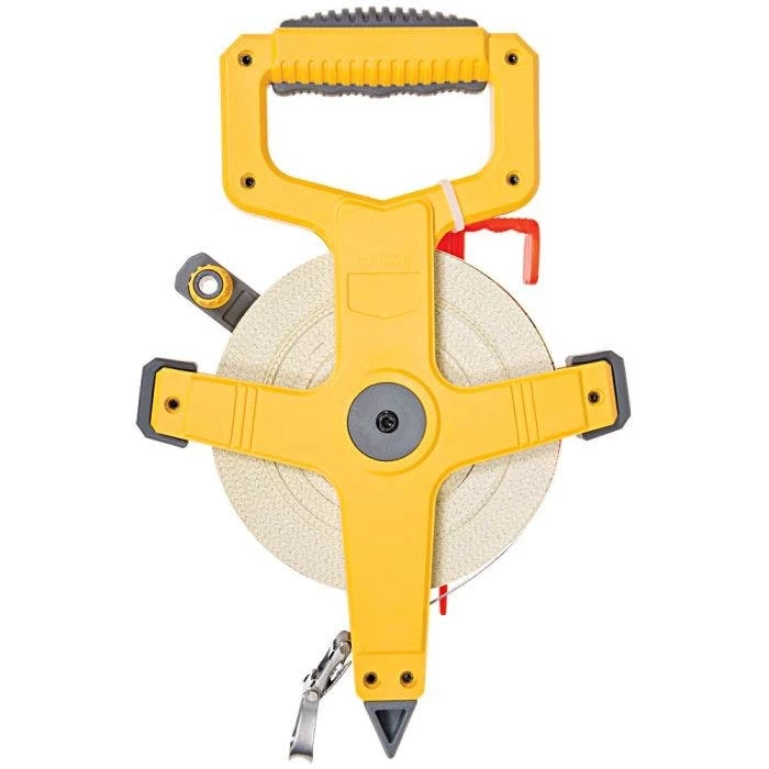 Heavy duty construction, yellow case, high impact resistant ABS body, printed two sides, inch and engineer’s 1/10th foot scale, fiberglass tape, numbers and graduation printed in black, comfortable rubber hand grip, 300ft.