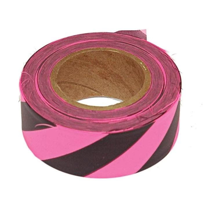 This Striped Flagging Tape features a durable plastic construction. Each roll of non-adhesive tape measures 1-3/16 inches in width and 150 feet in length. This box contains 12 rolls of black/glo pink-striped tape.