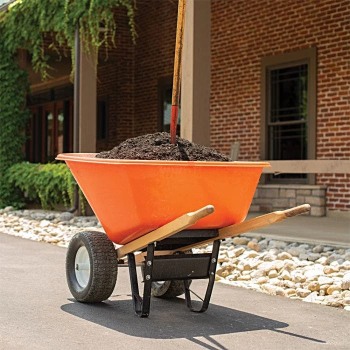 This Leonard 10-Cubic-Foot Capacity Poly Tray Wheelbarrow features a durable orange ABS plastic tray. We equip this wheelbarrow with extra-thick hardwood handles. These handles measure 1-5/8-inch by 2 inches and are 5 feet in length. Leonard Wheelbarrows feature a welded tray support, wide carriage bolt heads, and a heavy-duty undercarriage.