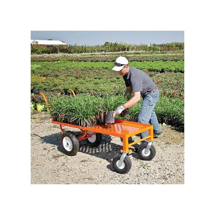 Leonard Push Style 4 Wheel Nursery Cart is ideal for moving nearly anything, including flats, potted shrubs, or bagged materials. The diamond punched grid on the deck makes the cart lighter and allows water to drain instead of pooling on the deck.