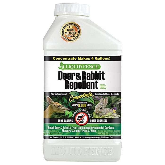 Liquid Fence Deer and Rabbit Repellent is a natural and long-lasting solution to keep deer and rabbits away from flowers, shrubs, vegetable plants, trees, and vines. It is a concentrate that can be mixed with water to make up to 3 gallons of spray, covering 6,000 sq ft. It is formulated with a safe and natural egg and garlic base that does not harm plants or animals.