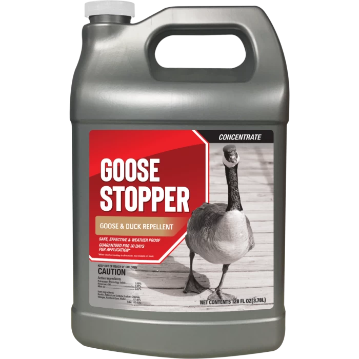 Messina Wildlife’s Goose Stopper works by smell and taste to prevent foraging by geese and other small herbivores. The active ingredients in the product are putrescent egg solids 5.80%, mint oil 3.37%, and rosemary oil 3.37%. It dries clear and odor-free and works by taste and feel.