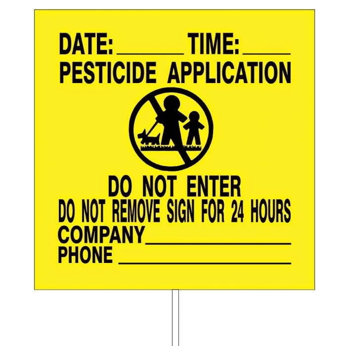 Quick Fill Pesticide Warning Signs are easy and fast marking solution made using corrugated plastic. They are used to mark areas where pesticides have been applied. Each sign includes a 16-inch PVC staff and measures 5 inches by 5 inches. They feature bold, black print on a bright yellow background. Each one has spaces for filling out the date and time of application and can be personalized with your company name and phone number.