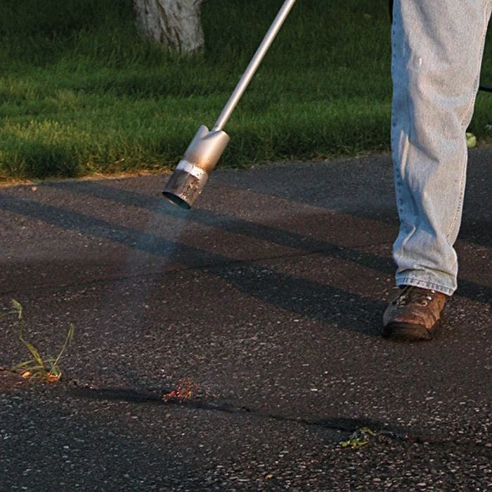 From weeds in the lawn, garden and driveway to weeds and brush in the fields, fence lines and irrigation ditches. Uses a gas grill type propane cylinder, not included. This model’s 2-1/2″bell, 400,000 BTU torch produces approximately an 18″ flame. This size is better suited for large coverage areas such as driveways, fence rows and ditches.