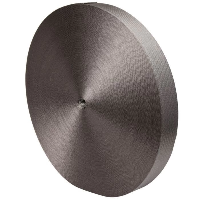 Strong 2″ wide strapping has a tensile strength of 5,000 lbs. This clean reclaimed seat belt webbing will be sent out in shades of gray on conveniently sized 330 ft spools, each spool having about five or six segments totaling 330 feet.