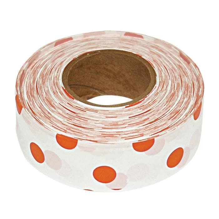 This Polka Dot Flagging Tape features a durable plastic construction. Each roll of non-adhesive tape measures 1-3/16 inches in width and 300 feet in length. This box contains 12 rolls of white/orange polka dot tape.